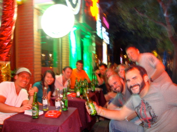 The night started at about 10 p.m. when on our way out, one of the students from Penn State called to confirm our meeting time and place. They had suggested earlier the Sanlitun area, which is directly on the other side of town from where Chris and I live, also on the third ring. Neither of us had ventured out that far yet, so Matt from Penn State told us to meet them at the subway stop. He informed me that he was a tall-ish white guy, which in my mind, seemed enough for identification. Alas, when Chris and I finally got to the other side of town nearly 45 minutes after the appointed time, the subway stop was deserted and there was no tall-ish white guy named Matt from Penn State. Taking a gamble, we grabbed a taxi to the Adidas building Matt had mentioned. Sure enough, there was a street lit up by bars. After wandering up and down yelling “Matt” at every possible foreigner we passed with no luck, we plopped down at an outdoor table and ordered a couple of Tsingtaos. Chris continued to mention Matt in some nonchalant way every time a tall-ish white guy walked by. No one even paused. And then—success!
