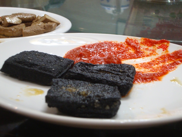 It’s chou doufu (stinky tofu), Anhui-style! Delicious. It’s a distinctive charred black, not the usual deep fried tofu brown color, and it’s actually made with dou gan (dried tofu) instead of regular tofu.