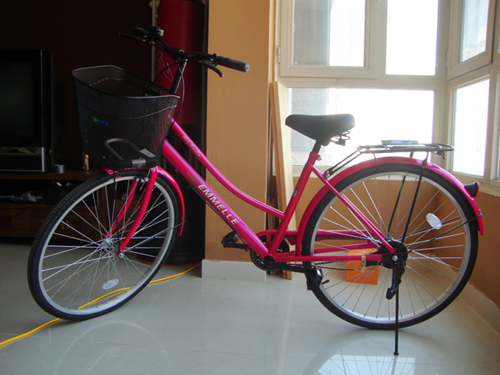 So this morning, bright and early (on a Saturday, no less!), I woke up and met up with my friend (he has two bikes!), who hauled me to a place with several shops. I was hoping to get a Giant, but they are pretty pricey and I wasn’t wild about many of the colors or styles. With bike thefts being pretty common, and considering how I might get attached to a Giant bike and not want to leave it when I eventually move back, I decided to go with what can only be a Chinese brand. There were a black chrome, dark blue chrome, yellow and pink one. Guess which one I chose!